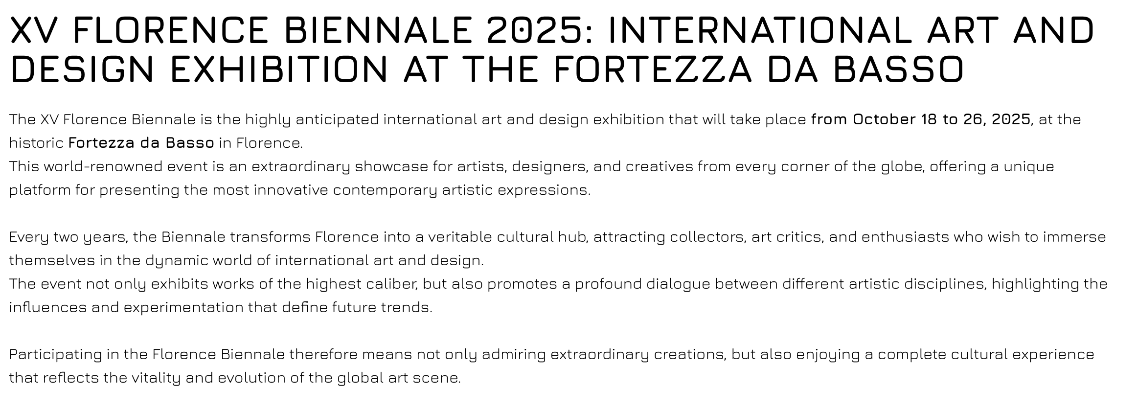 The XV Florence Biennale is the highly anticipated international art and design exhibition that will take place from October 18 to 26, 2025, at the historic Fortezza da Basso in Florence.